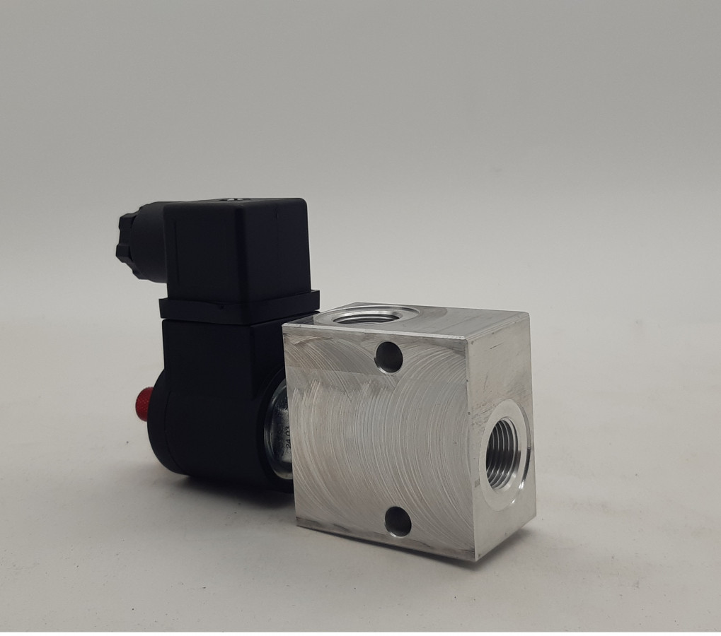 Elektromos működtetésű, 12V-os, "zár/nyit" típusú kétutas szelep, amely az olajáramlást egy hidraulikus vezetékben blokkolja.