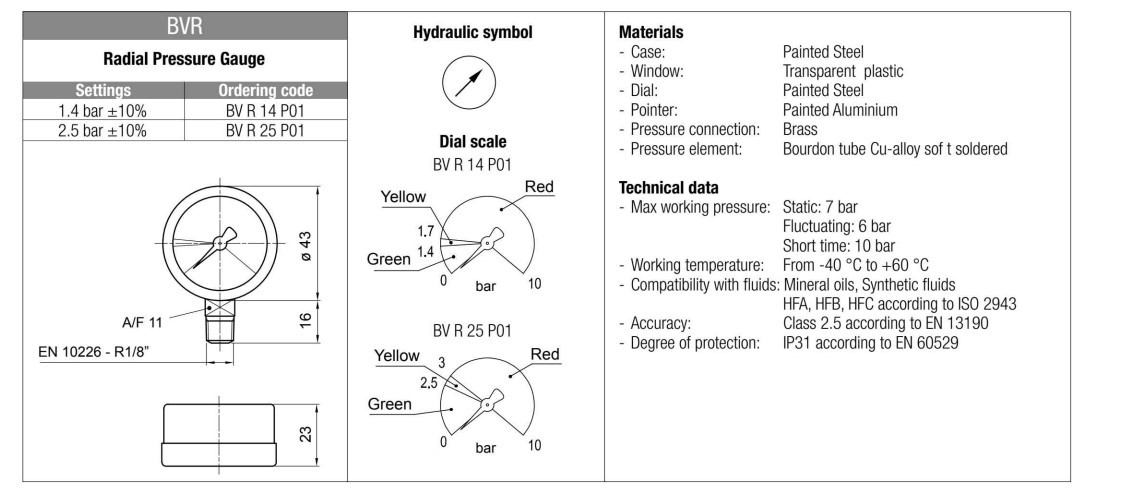 A BVR14P01 a szűrő eltömődésének vizuális mutatója. A beállított jelzőnyomás 1,4 bar.